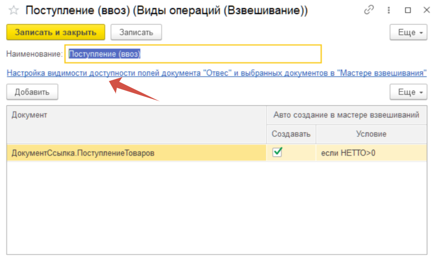В открывшемся окне необходимо перейти по гиперссылке Настройка видимости доступности полей документа «Отвес» и выбранных документов в «Мастере взвешивания»