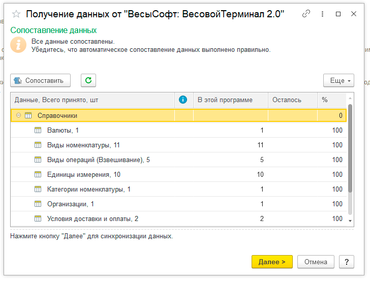 Жмем «Далее» и ждем окончания выполнения сопоставления.