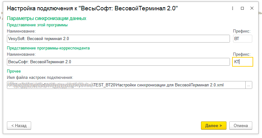 В следующем окне необходимо указать префикс второй конфигурации (мы обозначили его как КТ) и название файла с настройками синхронизации. Жмем Далее.