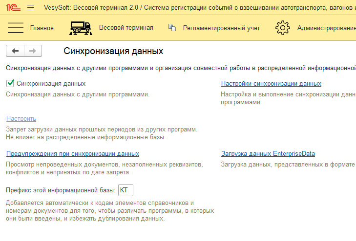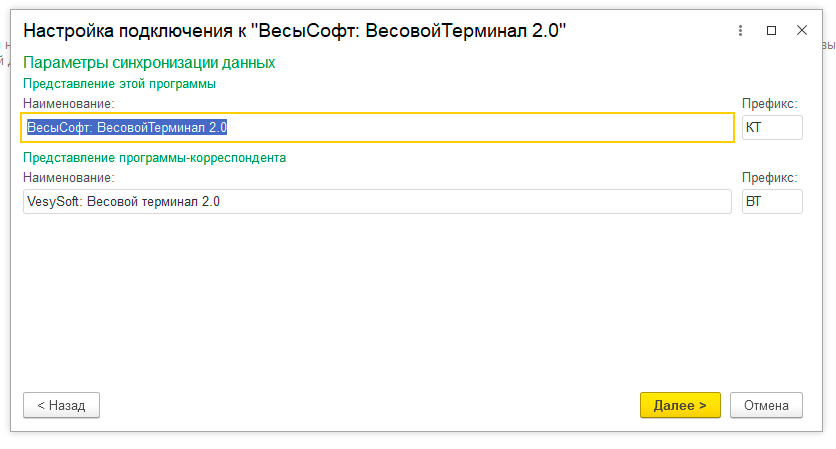 Для простоты объяснения обозначим одну конфигурацию Весовой терминал 2.0 как ВТ, вторую как КТ. Далее в тексте для понимания в какой конфигурации производятся настройки будем использовать эти обозначения. Эти же обозначение будем выставлять как префикс баз в настройках синхронизации.