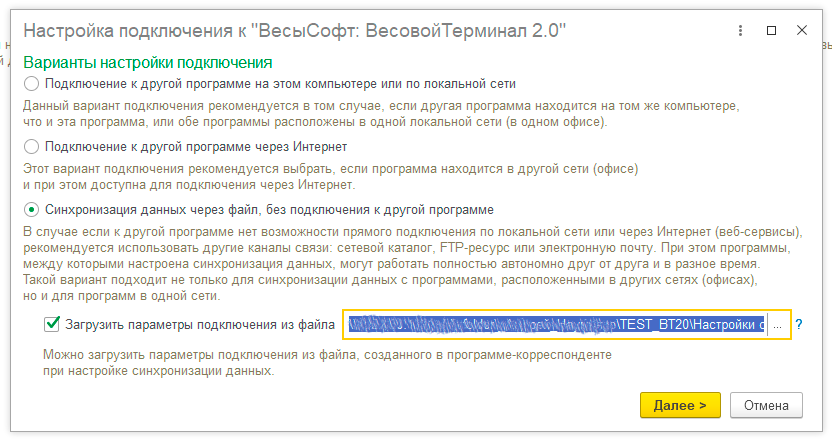 Выбираем Обмен с Vesysoft: Весовой терминал 2.0 и переходим по ссылке Настроить параметры подключения. В открывшимся окне выбираем пункт Синхронизация данных через файл, без подключения к другой программе и жмем Далее. Выбираем тип подключения, в нашем случае мы выбираем «Синхронизация данных через файл, без подключения к другой программе». Ставим галочку Загрузить параметры подключения из файла и выбираем файл Настройки синхронизации для ВесовойТерминал 2.0.xml, который мы создали на прошлом этапе при настройке в ВесыСофт: Весовом терминале 2.0.
