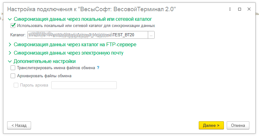 Для примера выберем Синхронизация через локальный или сетевой каталог и используя выпадающее меню укажем каталог для синхронизации. К этому каталогу обе конфигурации должны иметь полный доступ.