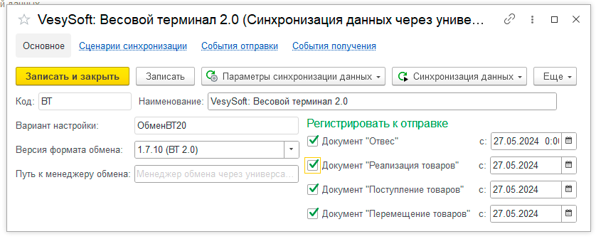 Переходим к этапу Настройка правил отправки и получения данных. В открывшемся окне необходимо проставить галочки в полях Регистрировать к отправке жмем Записать и закрыть для применения настроек.