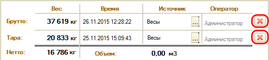 - Если производилось два взвешивания, оператор может отменить одно из взвешиваний (права на данную операцию устанавливает «Администратор»). Для этого откройте требуемый документ взвешивания и нажмите кнопку «Удалить отвес». Запись взвешивания будет вновь помечена как «незавершенное».