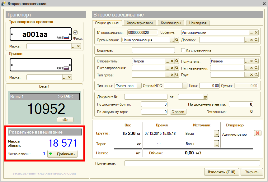 Каждый компонент груза взвешивается отдельно, при этом создается несколько документов взвешивания для каждого груза. После взвешивания БРУТТО, машина не съезжает с весов, оператор создает новое взвешивание для следующего груза и производит тарирование, только тогда транспорт съезжает. Далее ТС едет на загрузку следующего груза. Процесс повторяется, в итоге в журнале появляются несколько документов взвешивания.
