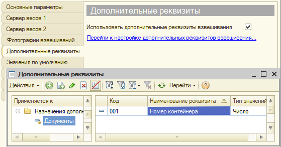 В случае, если для учета потребуются дополнительные реквизиты, которых нет в стандартных, есть возможность добавить список дополнительных реквизитов, пройдя в меню Сервис → Настройка программы → Дополнительные реквизиты, либо в Справочники → Дополнительные реквизиты. Добавленные реквизиты появятся в документе взвешивания в закладке «Дополнительные реквизиты».