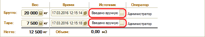 Чтобы осуществить взвешивание вручную, нужно в качестве источника данных выбрать «Введено вручную». Это позволит ввести время взвешивания, вес тары и БРУТТО с клавиатуры. Режим взвешивания вручную применяется в исключительных случаях и требует установки соответствующих прав для пользователя.