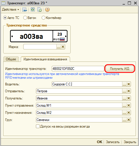 - Заполните оставшиеся поля, чтобы при следующей идентификации транспорта на весовой при взвешивании эти данные заполнялись автоматически в форму мастера взвешивания.
