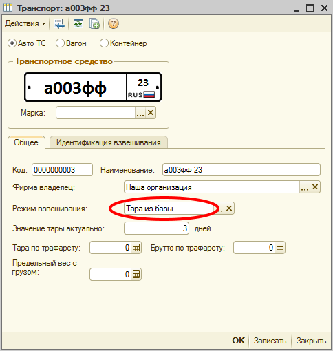 - Заполните номер транспорта, все поля и реквизиты, как обычном режиме взвешивания.