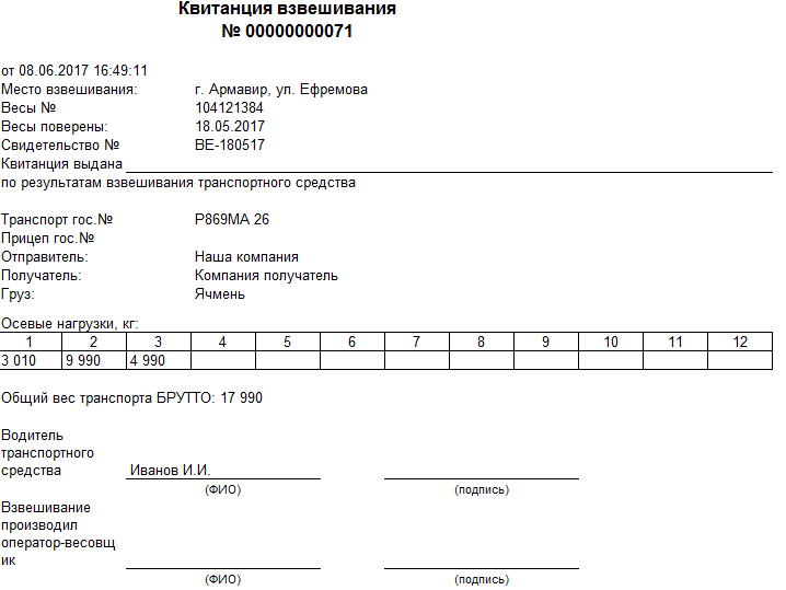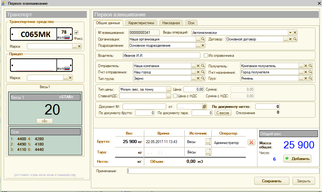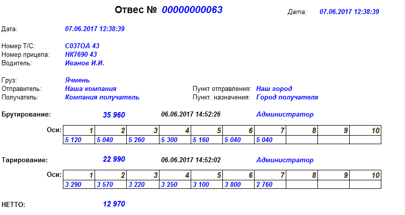 Результаты определения нагрузок на оси в конфигурации 1С "ВесыСофт: Весовой терминал"