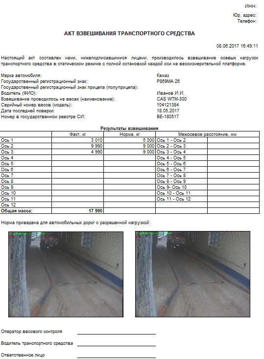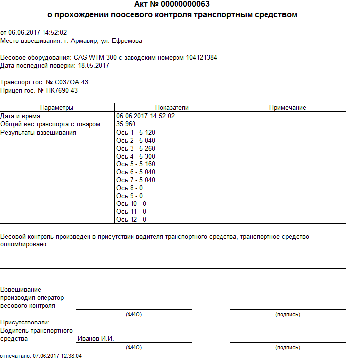 Результаты определения нагрузок на оси в ПО "Сервер Весы АВТО"