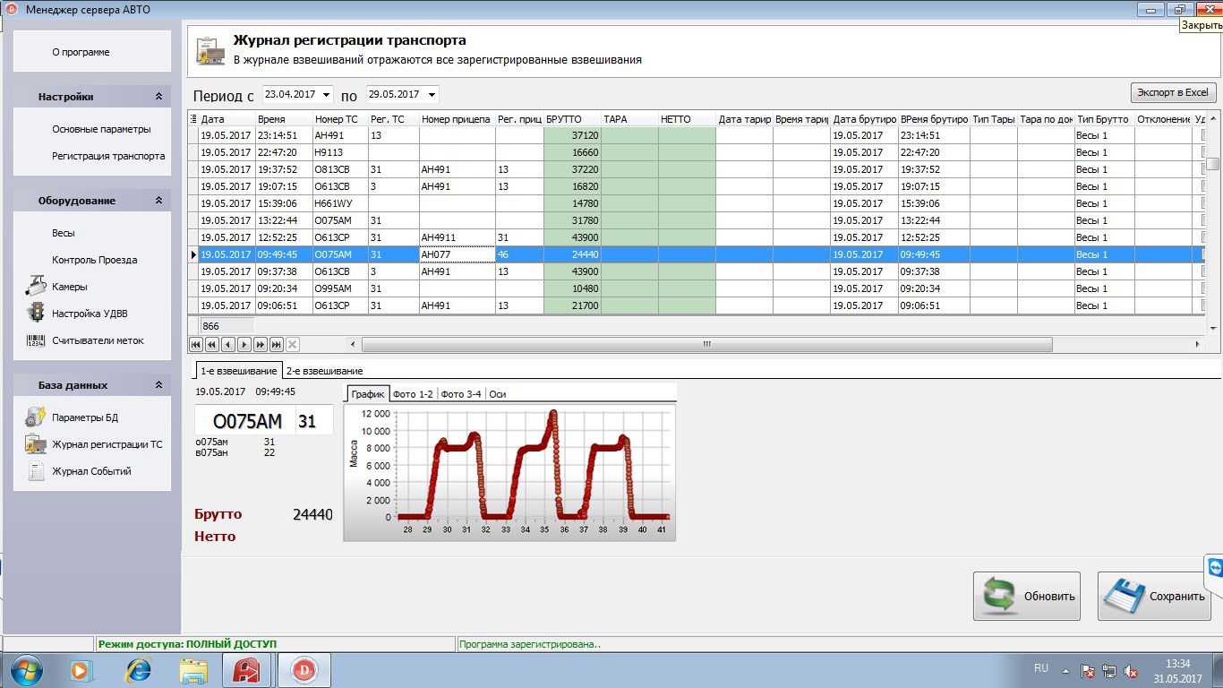 Результаты всех взвешиваний, выполненных с помощью ПО «Сервер Весы АВТО» хранятся в разделе «Журнал регистрации ТС». Для анализа качества и достоверности определения нагрузок на оси можно использовать график изменения показаний массы (открывается двойным щелчком мыши).