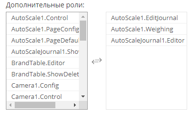 - В разделе «Дополнительные роли» установите (перенесите в правую часть) необходимый для данного пользователя набор прав (расшифровка в таблице ниже Описание параметров прав на выполнение операций в ПО "UniServer AUTO")
