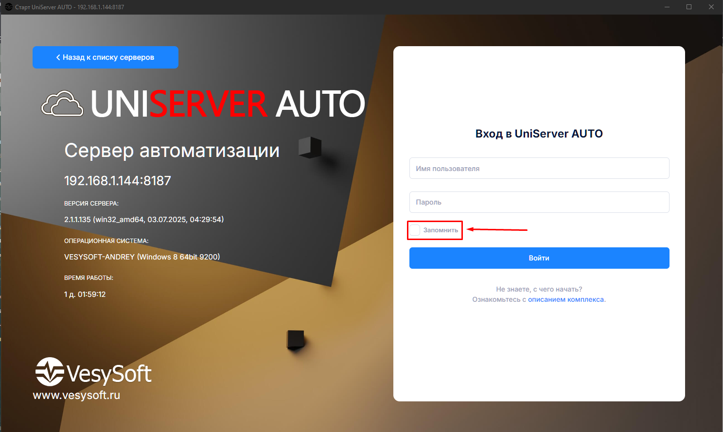 - В открывшемся окне авторизации в левой части отображаются данные о состоянии сервера. Введите имя пользователя и пароль для входа в UniServer AUTO (при первом запуске используйте данные по умолчанию: имя пользователя admin, пароль admin). Если это постоянные данные для входа, поставьте галочку Запомнить.