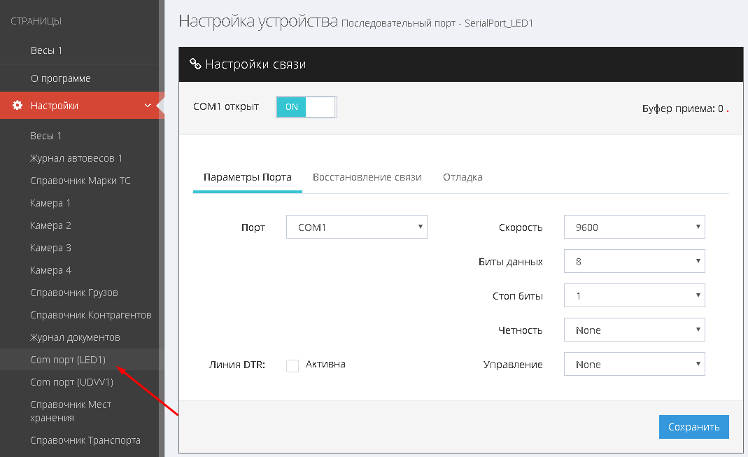 Произведите настройку параметров COM порта для подключения LED панели.