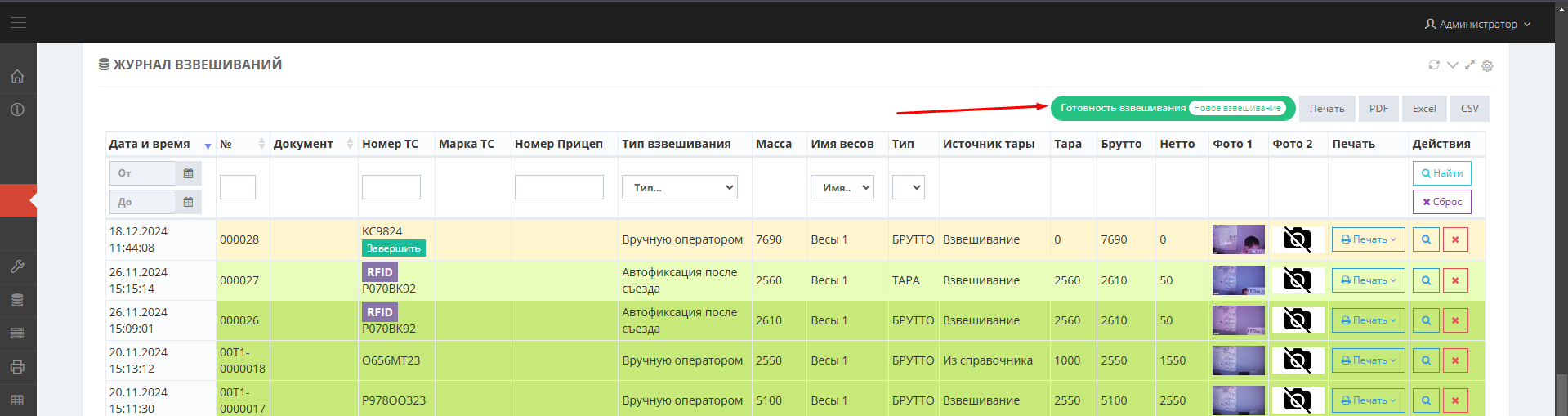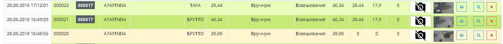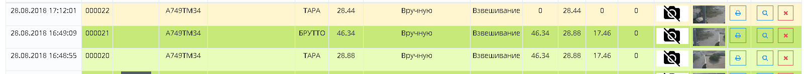 Каждое взвешивание обязательно производится в два этапа - взвешивание ТАРЫ и БРУТТО (не имеет значение что первым), если транспорт взвешивался один раз, то взвешивание считается незавершенным и в журнале выделяется желтым цветом при этом в таблице возле номера ТС отображается зеленая кнопка «Завершить», а завершенное - зеленым. Такой режим называется «Двукратный», т.е. производится в два этапа. Это стандартный режим взвешивания, позволяющий организовать достоверный расчет значения НЕТТО.