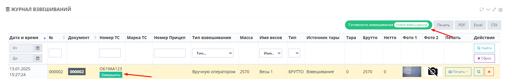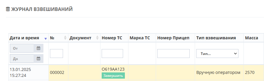В журнал добавляется строка с новым взвешиванием (желтым цветом обозначается незавершенное взвешивание при этом в таблице возле номера ТС отображается зеленая кнопка «Завершить»). Также для данного взвешивания был создан документ и его номер отображается в соответствующей графе.