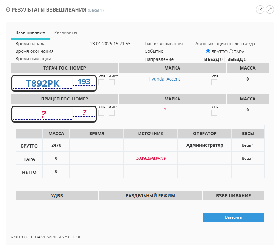 Во время процесса восстановления взвешивания система производит поиск незавершенного взвешивания по номеру ТС, и если находит его - соединяет эти два взвешивания.