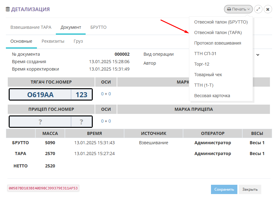 - Печать отвеса. Для того чтобы распечатать результат взвешивания откройте отвес из журнала взвешиваний кнопкой «Детализация». Далее кнопкой Печать выберите нужную печатную форму из списка возможных.
