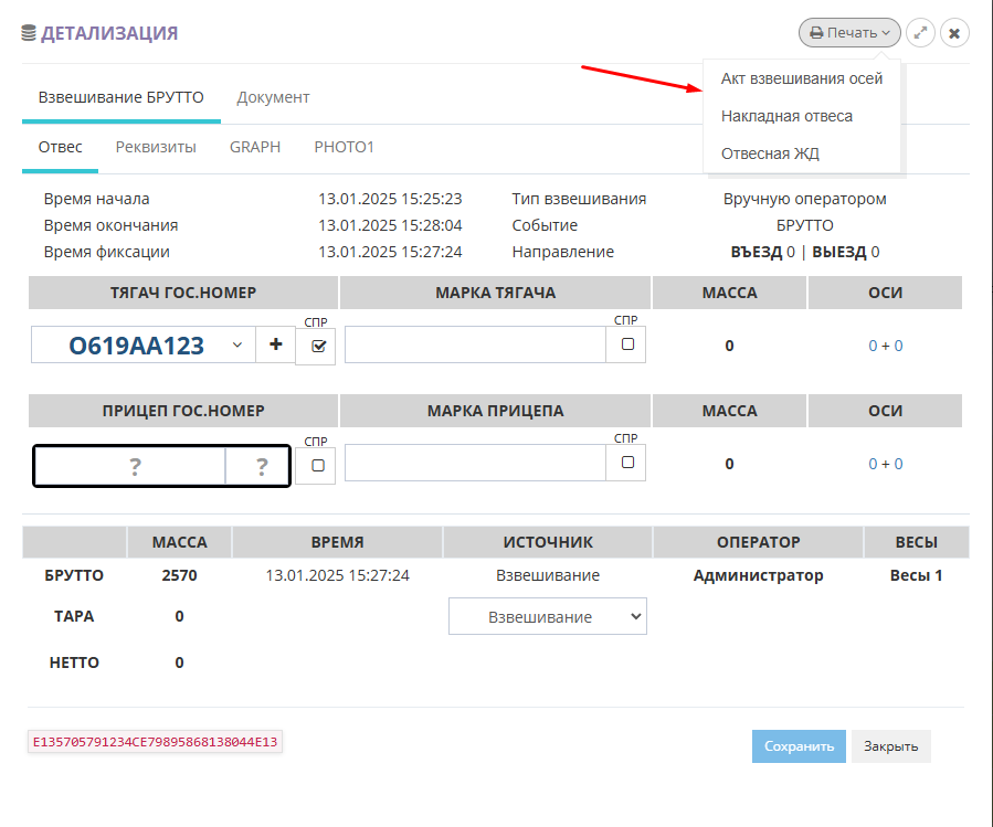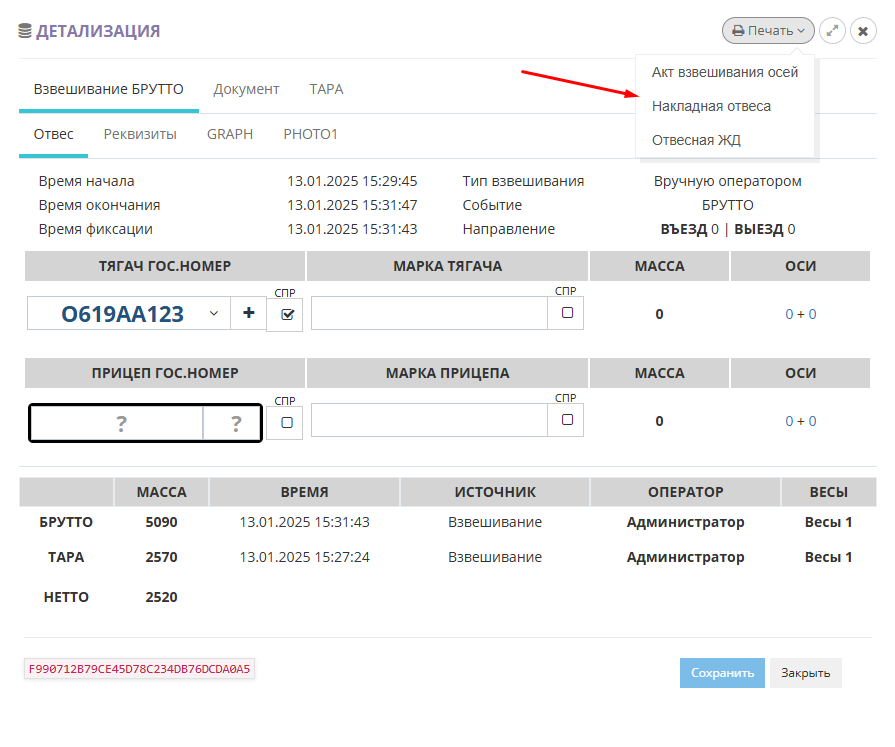 Для того чтобы распечатать результат взвешивания откройте отвес из журнала взвешиваний кнопкой «Детализация»
