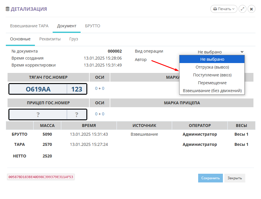 По умолчанию результат первого взвешивания автоматически запишется в БРУТТО. После второго взвешивания система сама определит, какому типу соответствует каждый отвес ТАРА или БРУТТО, и рассчитает НЕТТО. Исправлять или выбирать тип взвешивания (ТАРА или БРУТТО) не требуется.