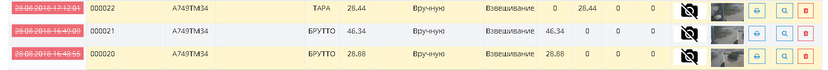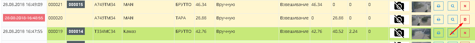 Для того, чтобы отменить ошибочно произведенное взвешивание откройте журнал автовесов и нажмите на соответствующую пиктограмму на строке ошибочного взвешивания.