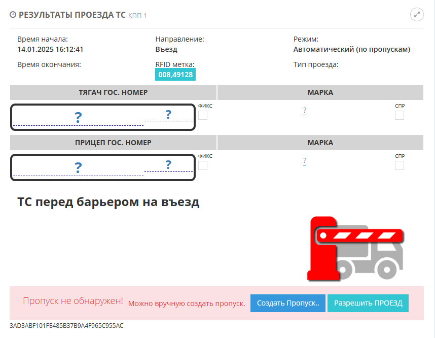 Так как система «UniServer AUTO: КПП» является системой контроля проезда, без идентификации транспорта проезд будет считаться незавершенным.