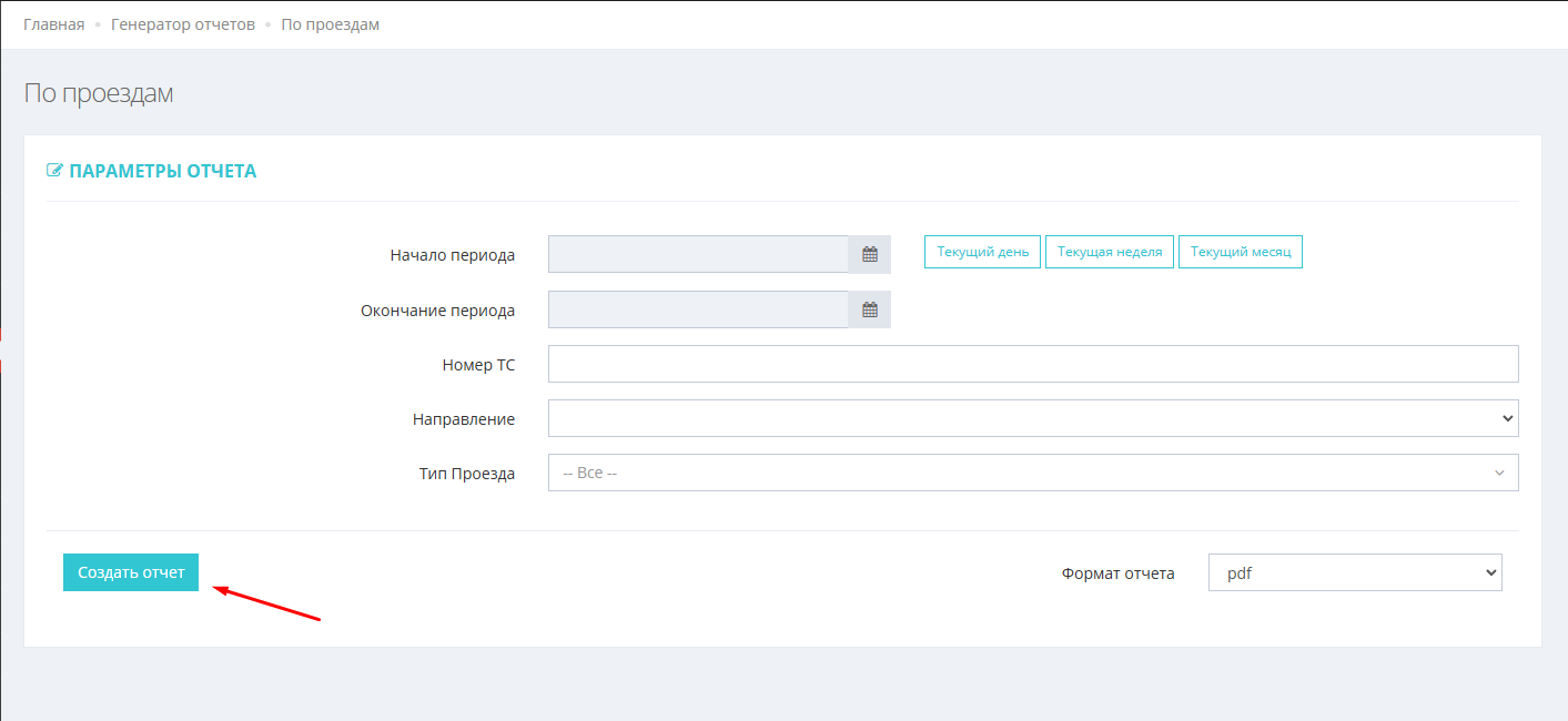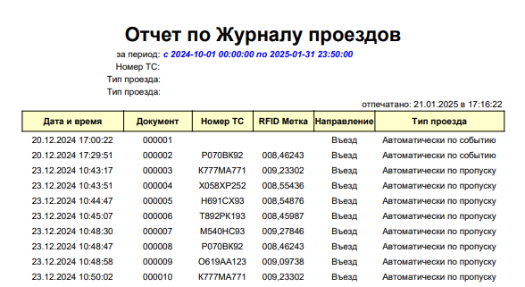 В программе представлена печатная форма отчета По проездам, который вы можете создать по заданным параметрам: Период, за который формируется отчет, Номер ТС, Направление, Тип проезда.