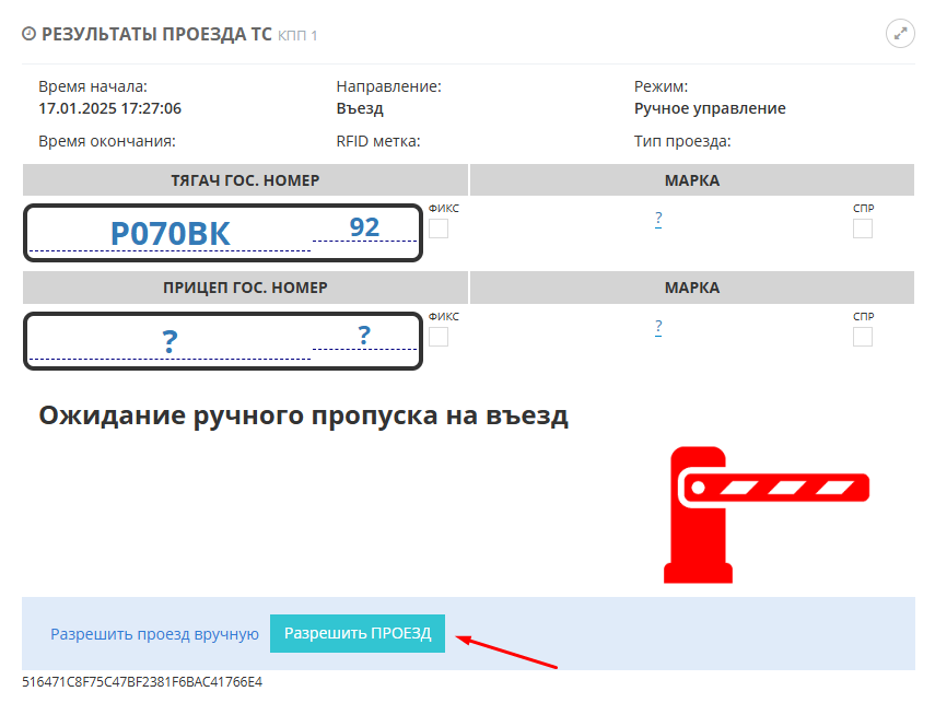 - Как только транспорт будет идентифицирован появится кнопка «Разрешить проезд». Нажмите эту кнопку. После этого проезд будет завершен.