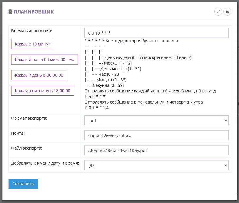 - «Время выполнения» - расписание формирования отчета в типовом формате известного планировщика cron. С помощью данного формата можно задать любую цикличность формирования отчета (примеры составления команды-расписания представлены на скриншоте ниже, а также в окне настройки задачи);