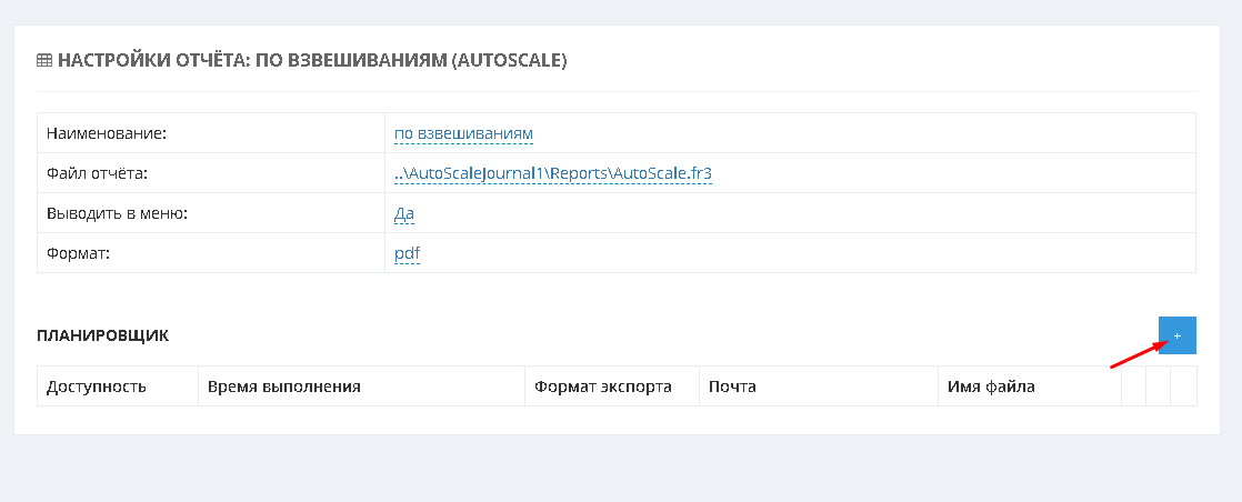 Чтобы добавить задание для автоматического формирования отчета в планировщик, нажмите кнопку «+» справа над таблицей. - В открывшемся окне заполните следующие поля: