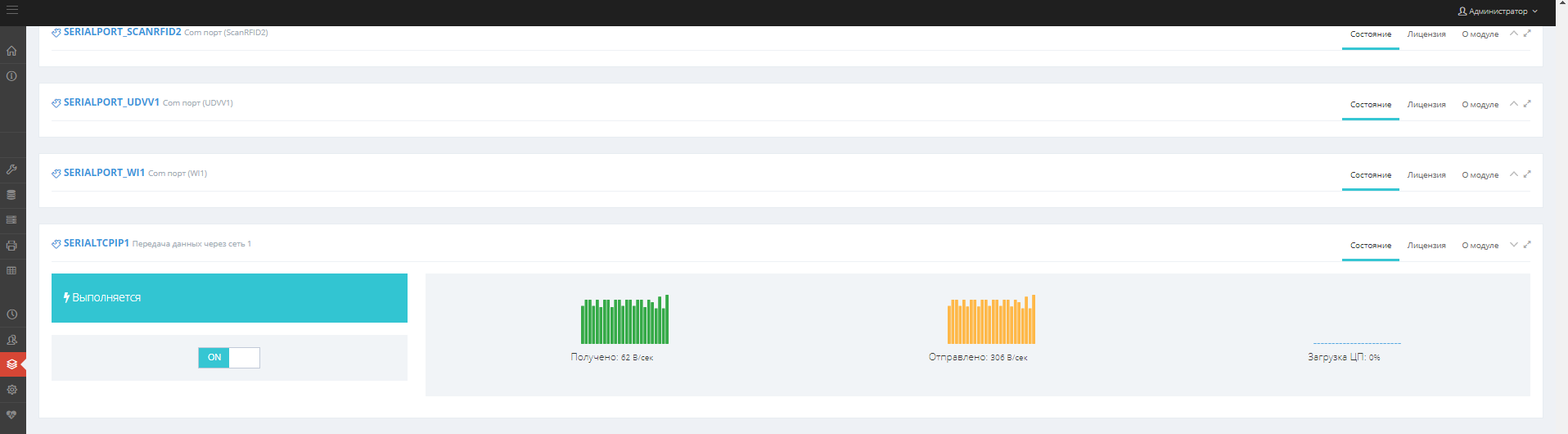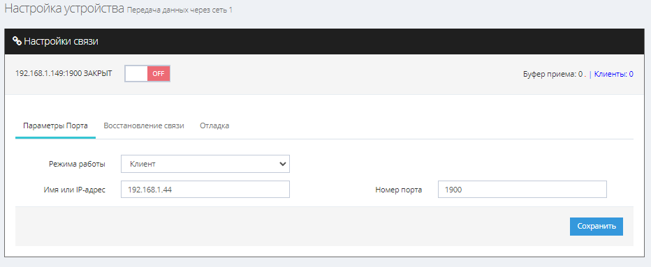 Теперь переходим во вкладку «Настройки» → Порт TCP/IP. Тут необходимо указать IP адрес весового индикатора, в нашем примере 192.168.1.44, порт выставленный на устройстве 1900, а так же выбрать режим Клиент. После завешения настроек нажать «Сохранить» и включить прием (вверху красная кнопка OFF, нажмите на неё и она станет зеленой кнопкой ON).