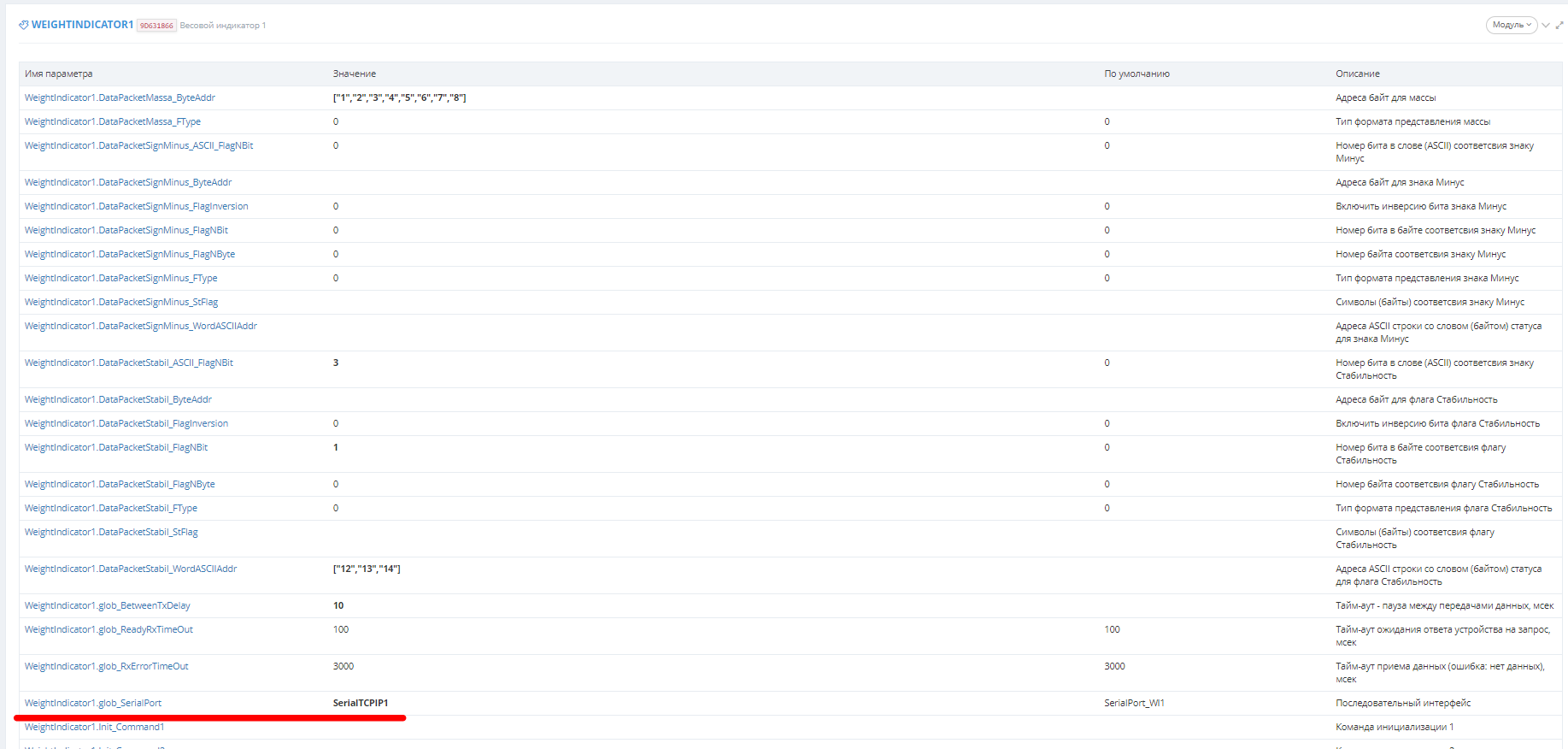 Следующий шаг переходим во вкладку «Параметры» и находим плагин WEIGHTINDICATOR1. Среди его параметров находим WeightIndicator1.glob_SerialPort изменяем его на SerialTCPIP1.