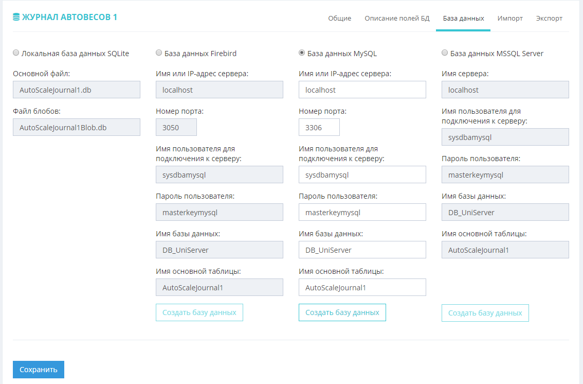 Настройка журнала (справочника) на использование СУБД "MySQL"